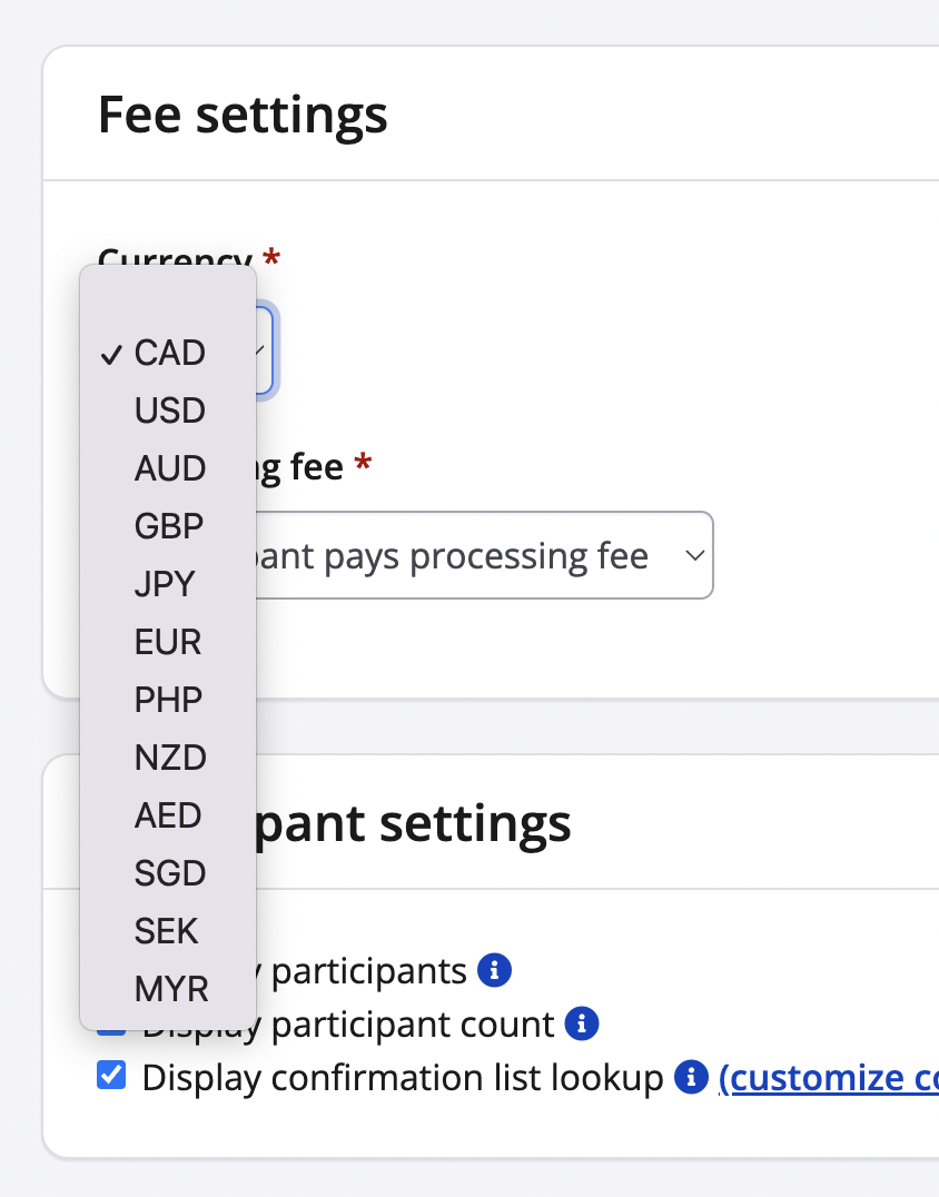 Race Roster currently allows for 11 different currencies on the platform to be accepted for registration payments. When creating an event, the event organizer has the option of selecting their accepted currency during the initial setup. The list of available countries/currencies to select from is below.