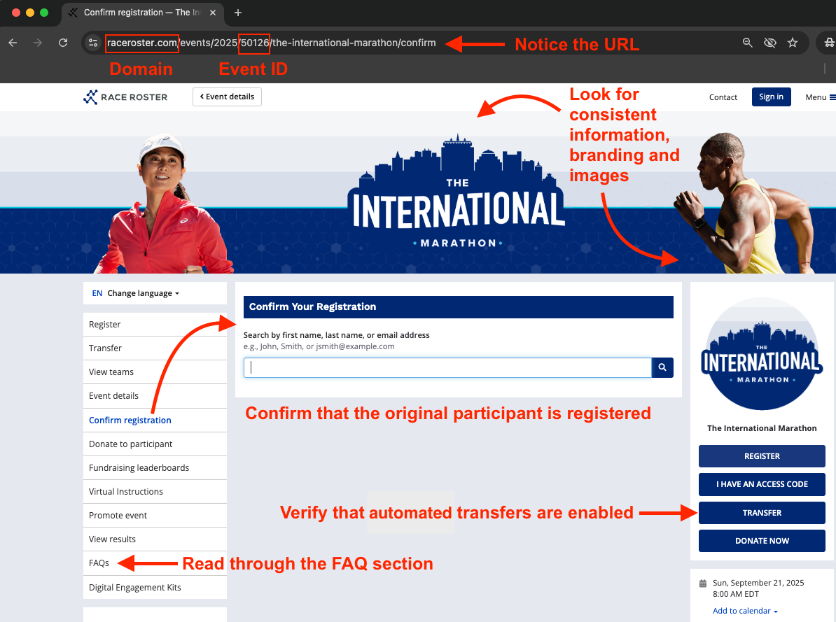 When you receive an email prompting you to complete a transfer on Race Roster, make sure that all the details align, including the email subject line and URLs of any links or buttons (trick: hover over a hyperlink for a preview of the URL, or copy and paste it into a new browser tab to view it before actually visiting the page).