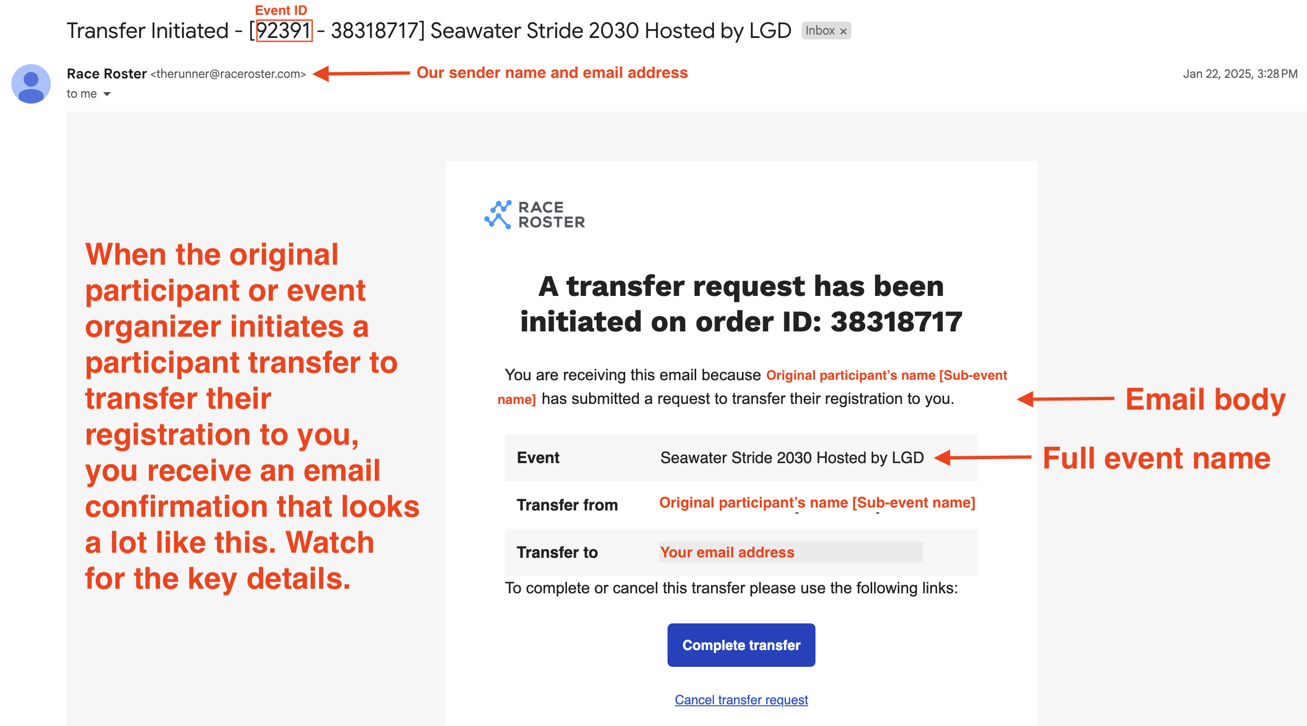 When a participant transfer is initiated, two emails are sent from therunner@raceroster.com: