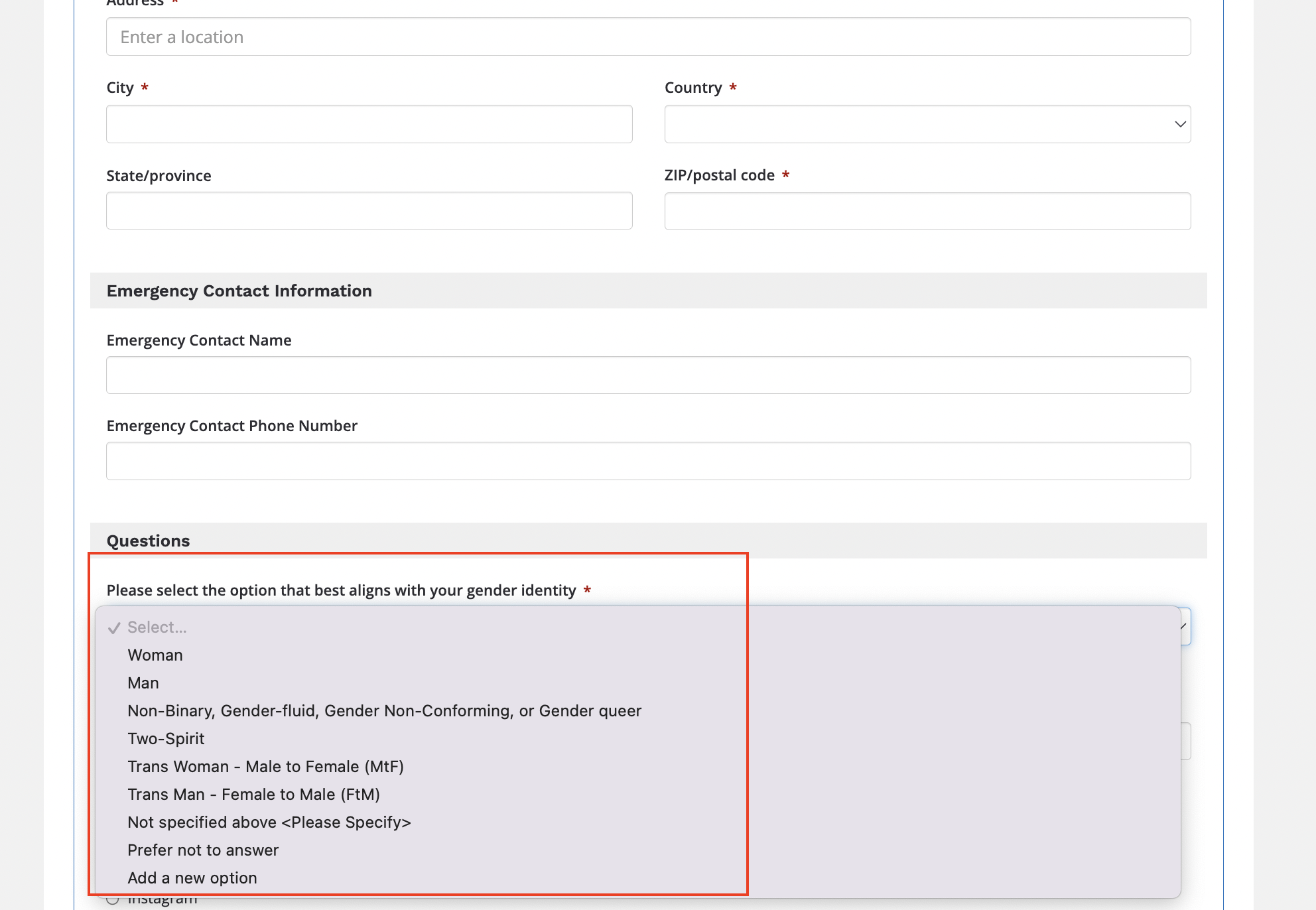 Creating a custom registration question with up to 8 gender-encompassing terms