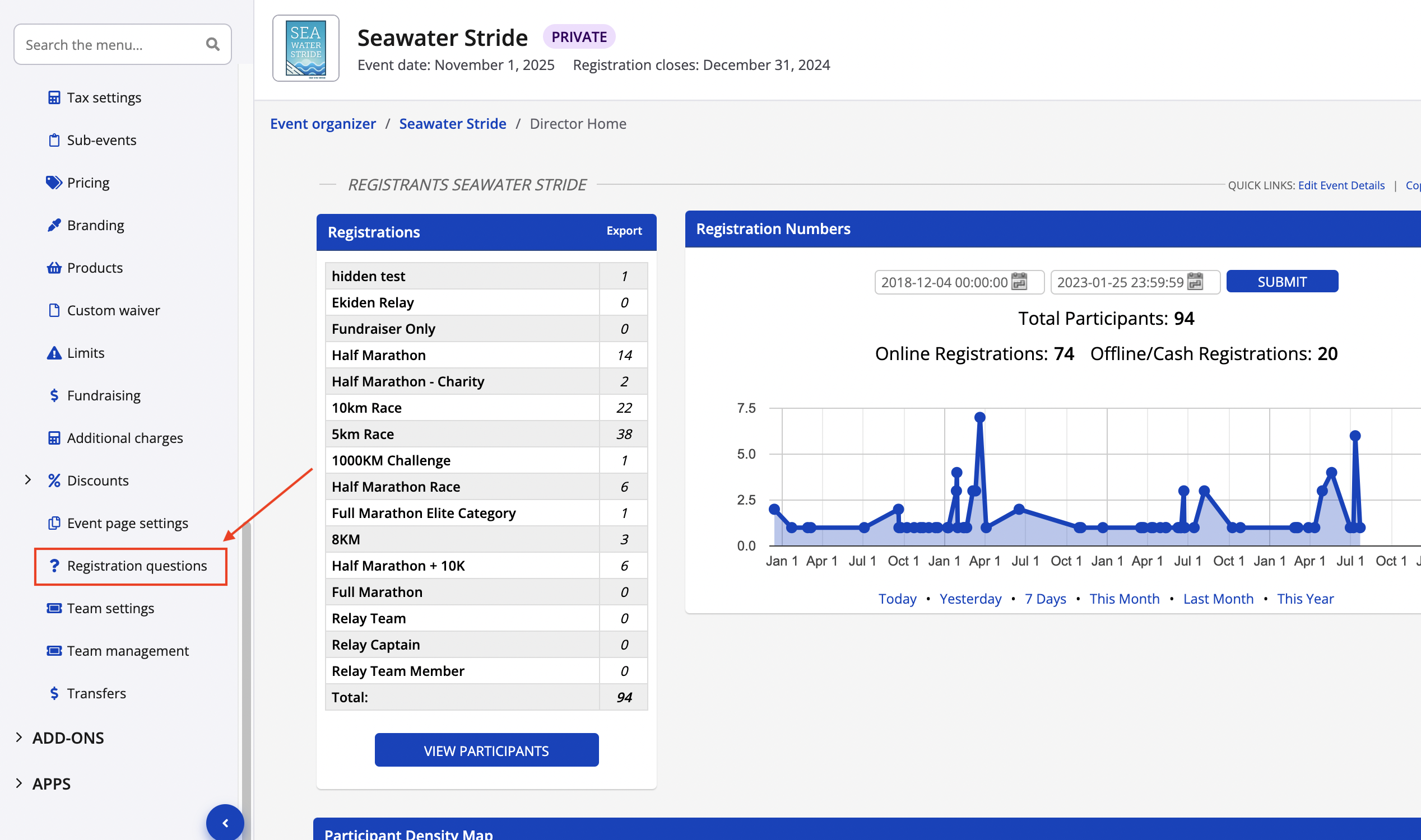 1. From your event dashboard, click on registration questions under the settings tab from the lefthand menu.