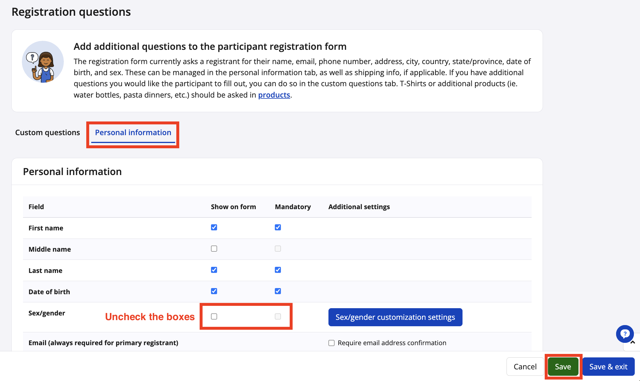 2. From your registration question settings, click on the personal information tab to view the default personal information questions asked during the registration process. This is where you can select the system-coded sex or gender formats. Uncheck box for sex/gender under the "show on form" and "mandatory" columns to remove these default formats from displaying in your registration process. Click save once the setting is unchecked.