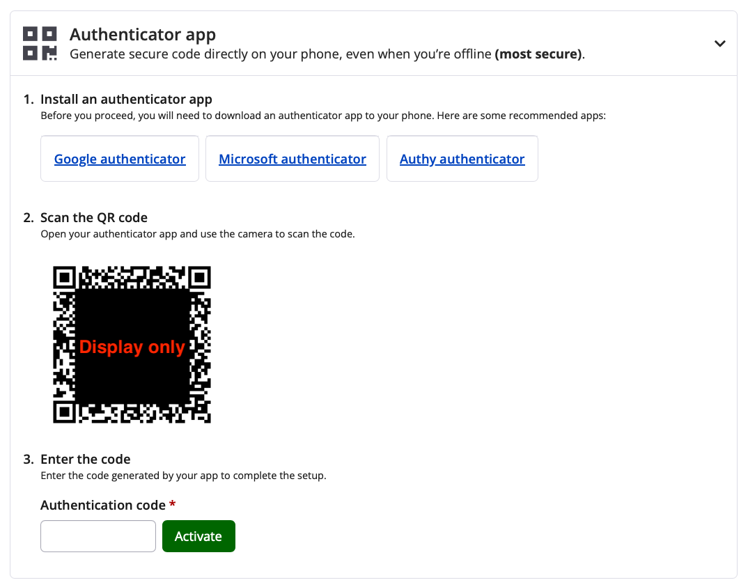 - After entering the 6-digit code into the "Authentication code" field. Click the green "Verify & activate" button.