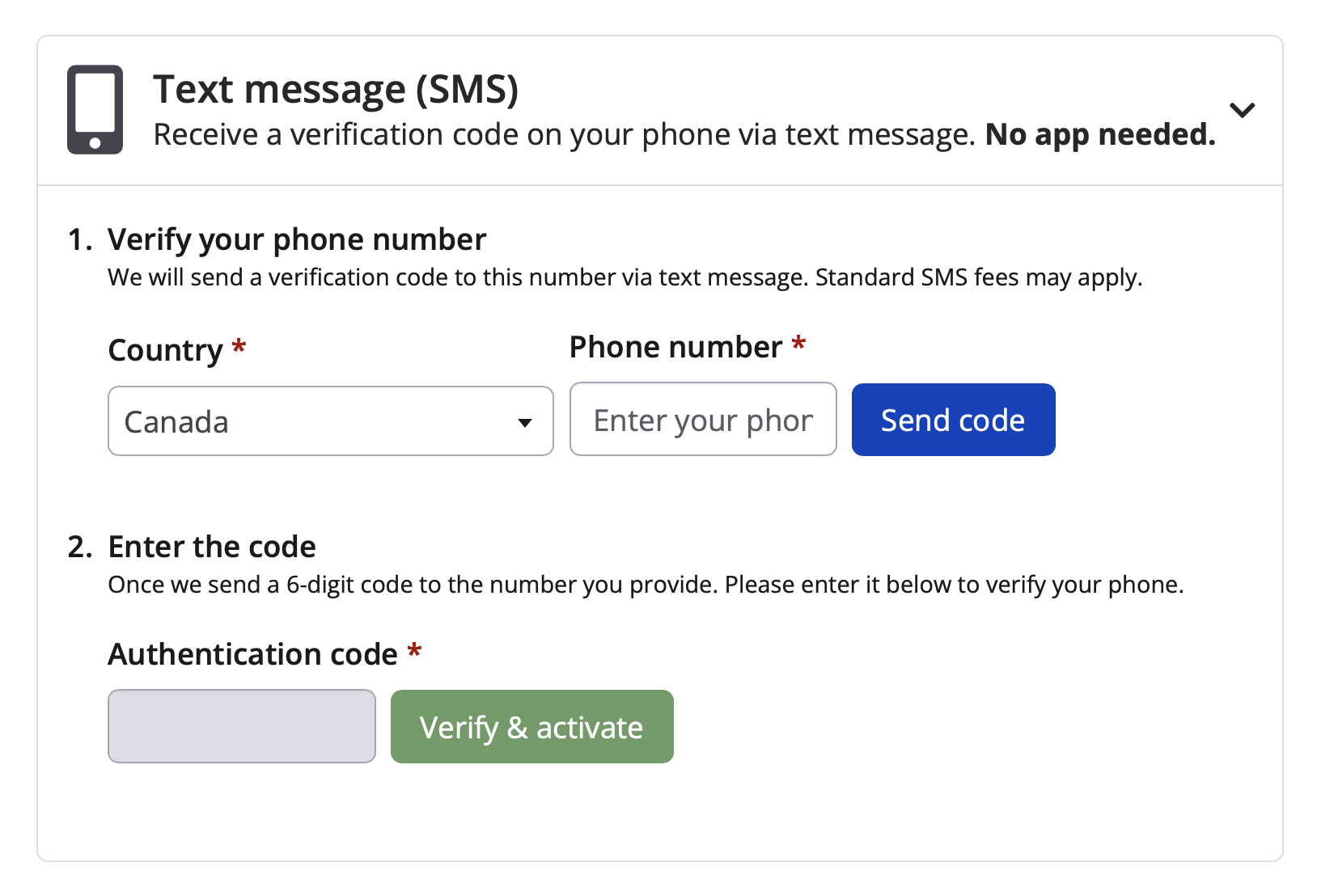 The SMS option is available to users with phone numbers from the following countries: United States, Canada, Japan, Singapore, New Zealand and Australia.