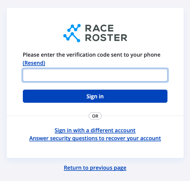 - If you signed into Race Roster using the same mobile device on which you received the SMS text message, return to your web browser to the page on Race Roster where you may enter the code.