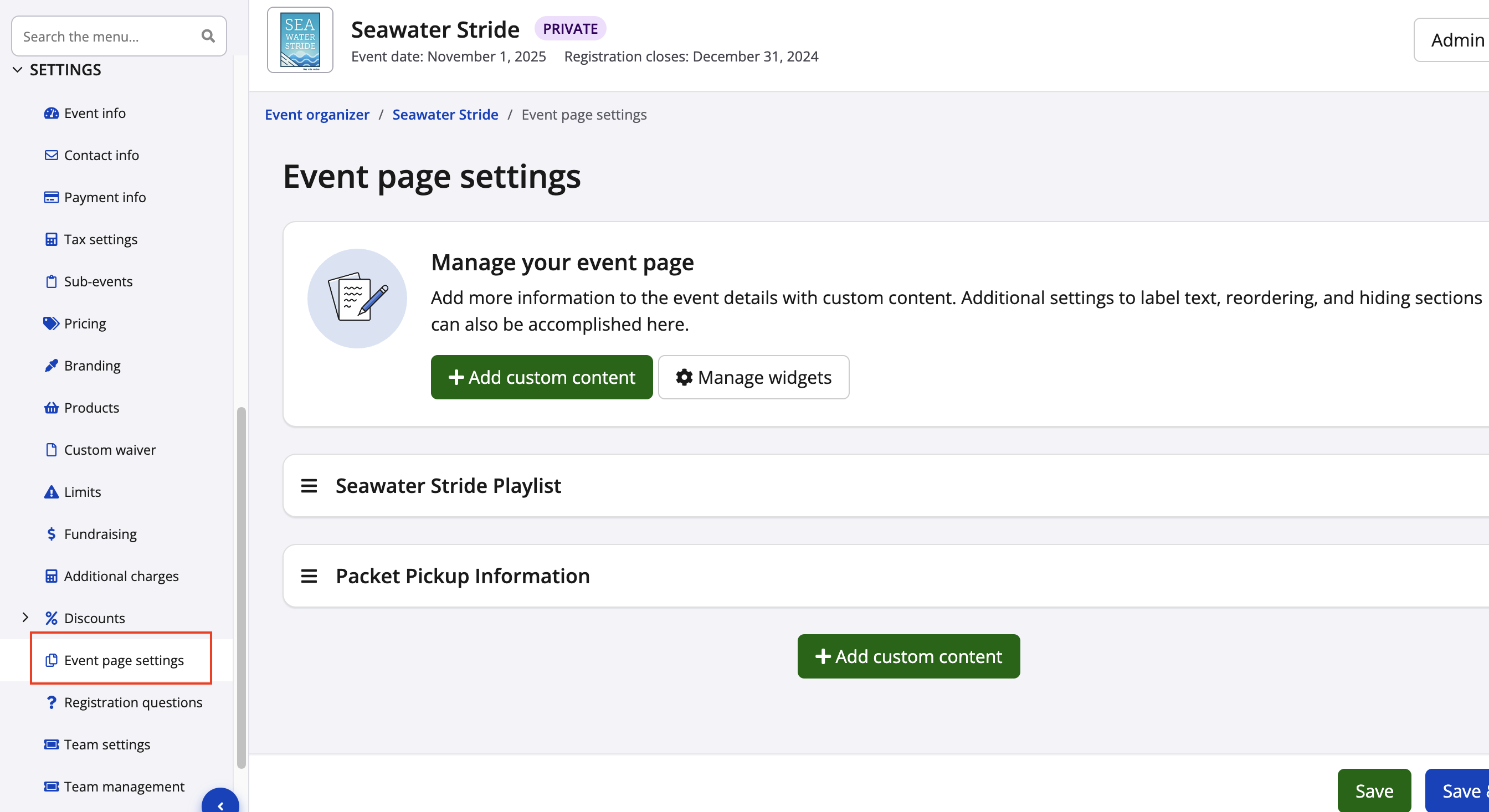 3. You will then land on the Event Page Settings page where you will be able to Add Custom Content or Manage widgets.