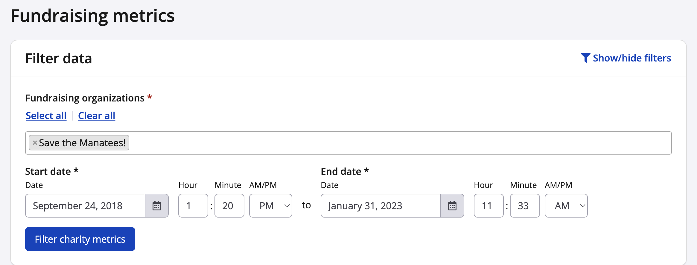 4. Filter your charity metrics by date range and/or filter by charity (if you have more than one charity)