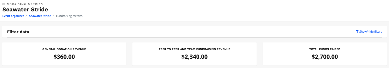 5. The top section will review the general donation revenue, peer to peer and team fundraising revenue, and total funds raised