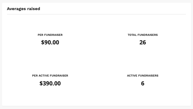 8. Averages raised provides metrics based on peer-to-peer fundraising on the averages raise per fundraiser, per active fundraiser, number of all fundraisers, and the total number of active fundraisers