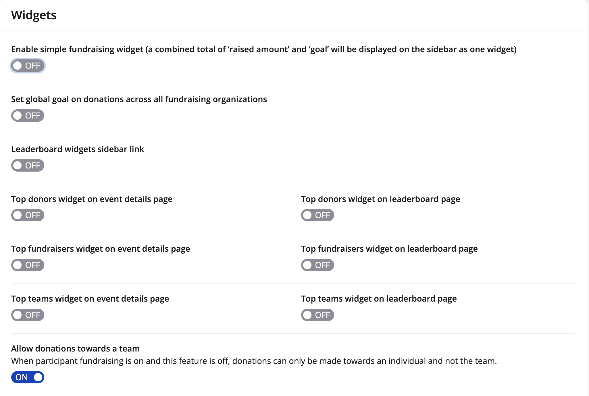 8. Toggle top fundraisers widget and enter the number of results to display on the event page