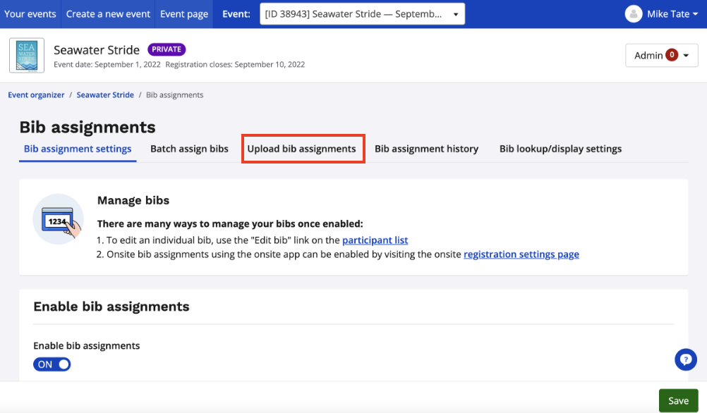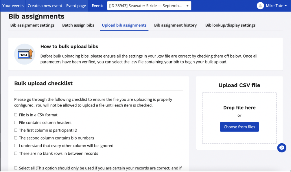 2. Select the event you are assigning bibs for from the drop down at the top of your page