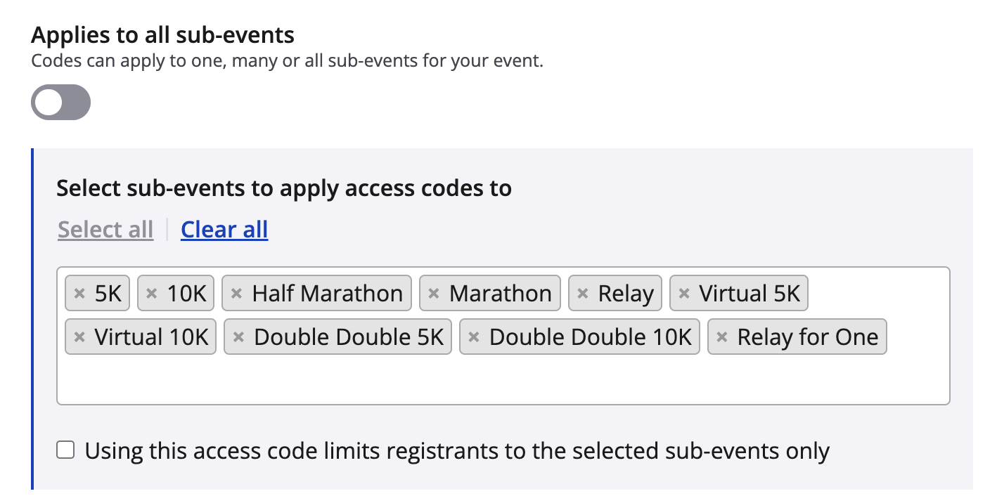 4. Next if you want the access code to only apply to specific events, deselect Applies to all sub events and using the x remove the sub-events that do not apply