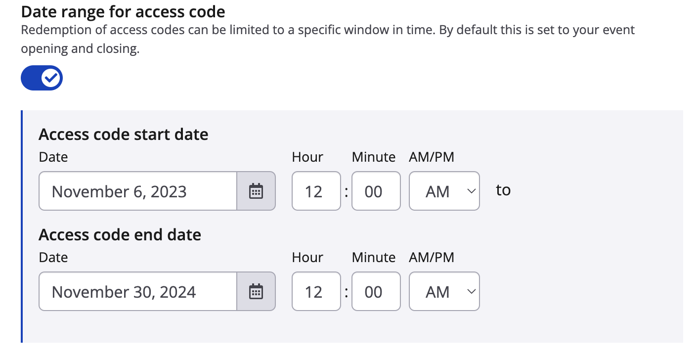 5. Now set the Time Window (optional) you would like this code to be valid for entry. By default this is set to your event open and close dates. Note: As this is an access code you CAN set these dates outside of the regular registration open and close dates, which is helpful when trying to register people pre or post event