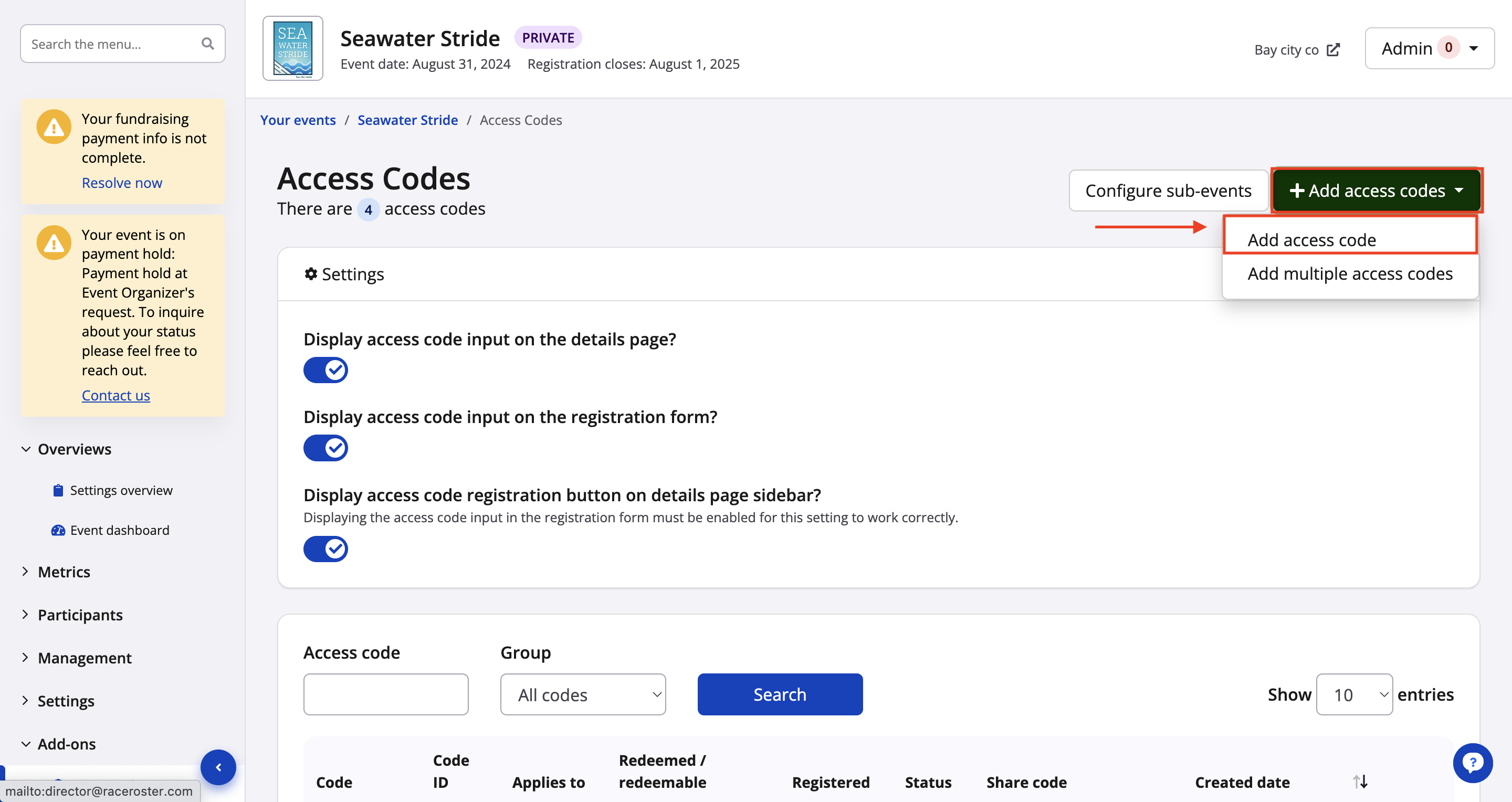 2. From the access codes page select +Add Access Codes in the top right hand corner, and click Add Access Code