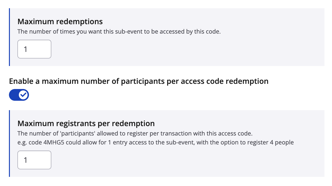 a) Check the box next to The # of times you want this sub-event to be accessed by this code and under Maximum Redemptions enter the number of times you want the code to be used to access the registration form for your selected sub-events e.g. if you wanted 50 people to be able to get to the registration page for the half marathon set the amount to 50 (limit # per transaction in point 9. b)