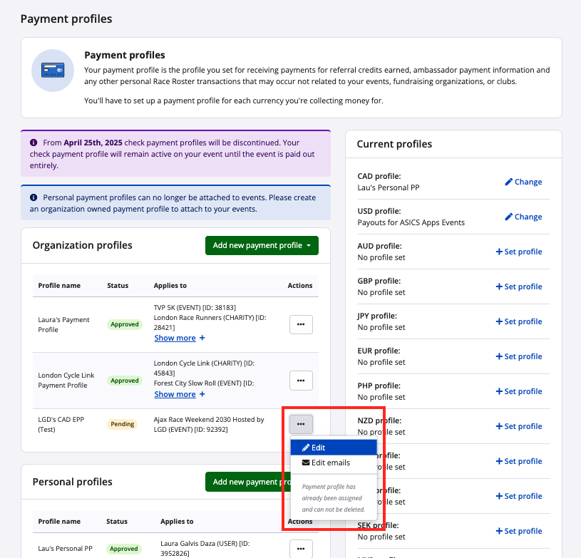 To update a payment profile, please note that you can only do so if the profile is PENDING. If the payment profile is APPROVED, please have the payment profile owner email director@raceroster.com requesting the profile be rejected so that you can update.