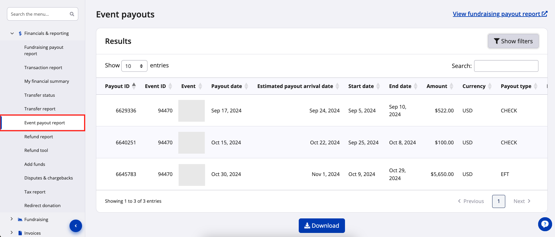 3. You will then be directed to the Event payouts page where you can find a list of financial payouts.