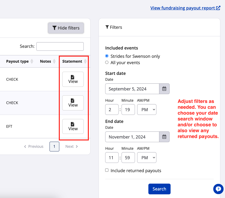 4. Click view under the statement column and a pdf statement will open in a new window. Be sure to adjust filters to be able to locate what you're looking for.