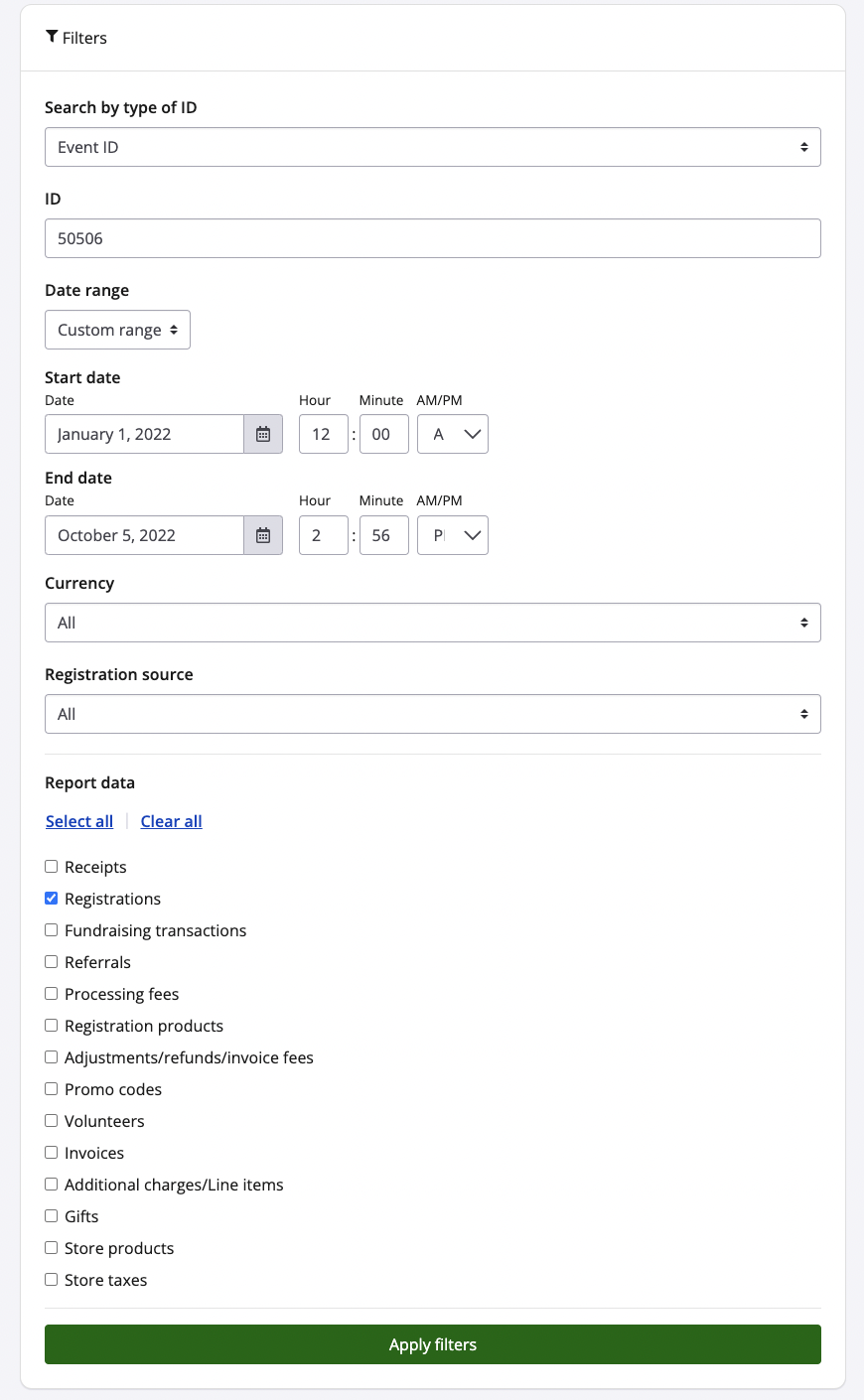 - Verify that the ID type (event ID, transaction ID, user ID or charity ID) and ID number within your search filters are accurate