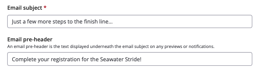 keep the email subject line as our default "Just a few more steps to the finish line..." or write in your own; the point is for the subject and pre-header to politely remind the recipient to complete their registration