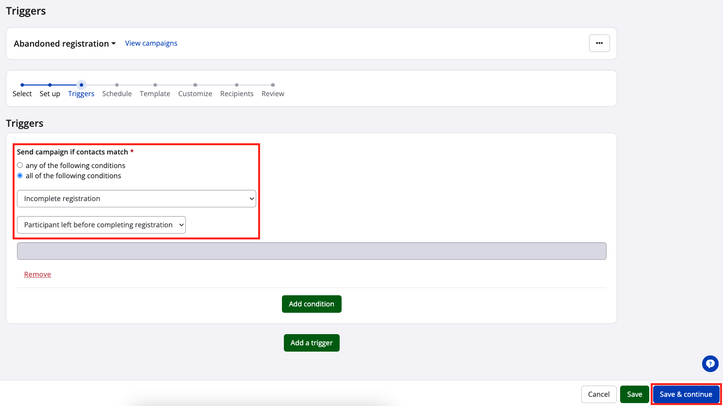 You may add additional conditions to suit your event needs. For example, perhaps you want the email sent only to abandoned registrations of a specific sub-event. However, this trigger setup is the minimum necessary to send an email campaign to those with incomplete registrations. Once that's done, click the "Save & continue" button.