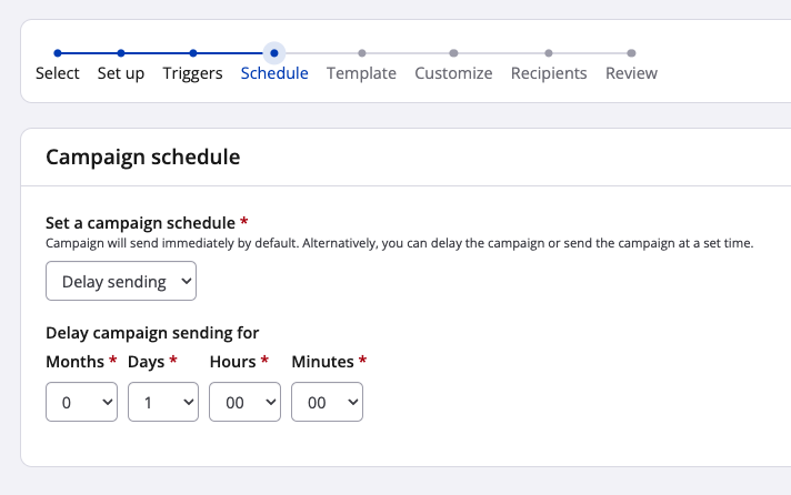 4. Within Schedule (step 4) of your campaign, "Delay sending" will be the only option for campaign schedule type. Select the "Delay campaign sending for" timeframe. For example, if you'd like the campaign sent 24 hours after the user abandons their registration, select 0 Months, 1 Days, 00 Hours and 00 minutes. The minimum delay is 1 hour. As always, click to save and continue.
