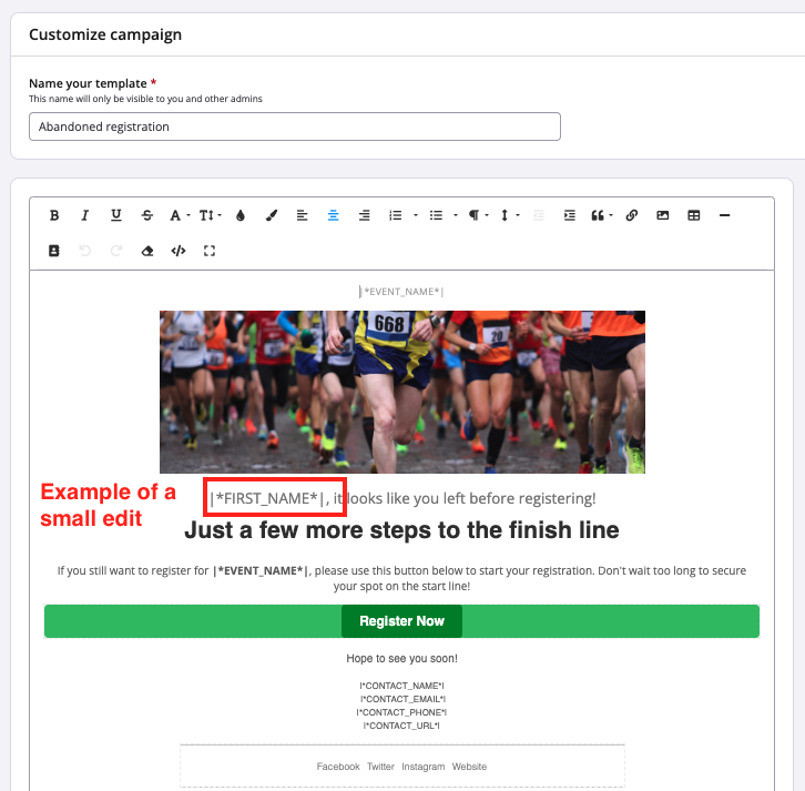 7. In Customize (step 6), add or remove text, image and merge tag elements to tailor the email body you would like to send out to incomplete registrants. Text, images and merge tags within the abandoned cart email template can be changed and customized as well. Rename the template if needed.