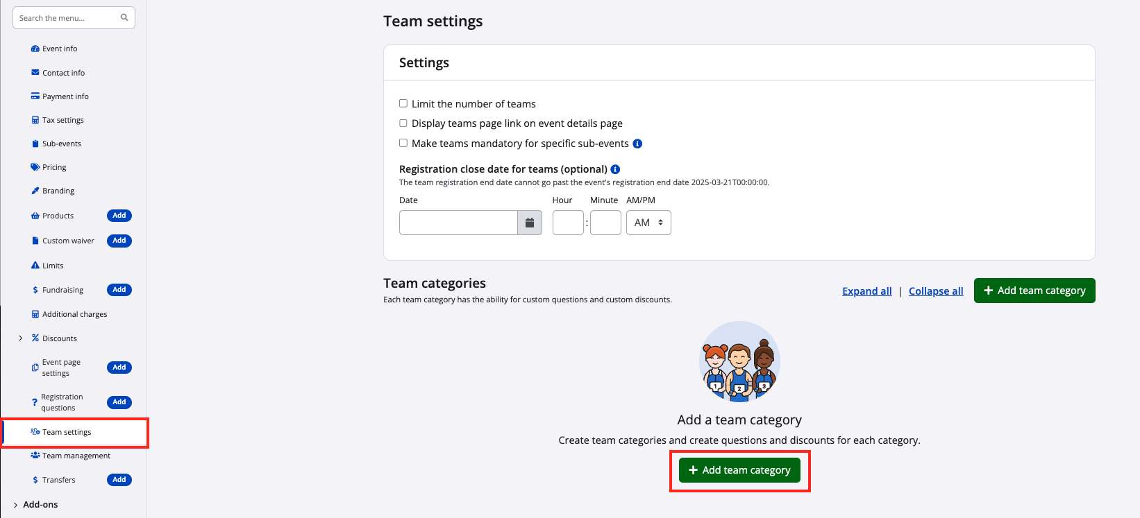 In order to allow participants to create and/or join teams while registering for your event on Race Roster, you must first create team categories for those teams to belong. A team category constitutes the type of team, with a set of rules about how creating, filling out and managing the team will work both in-registration and through the dashboards.