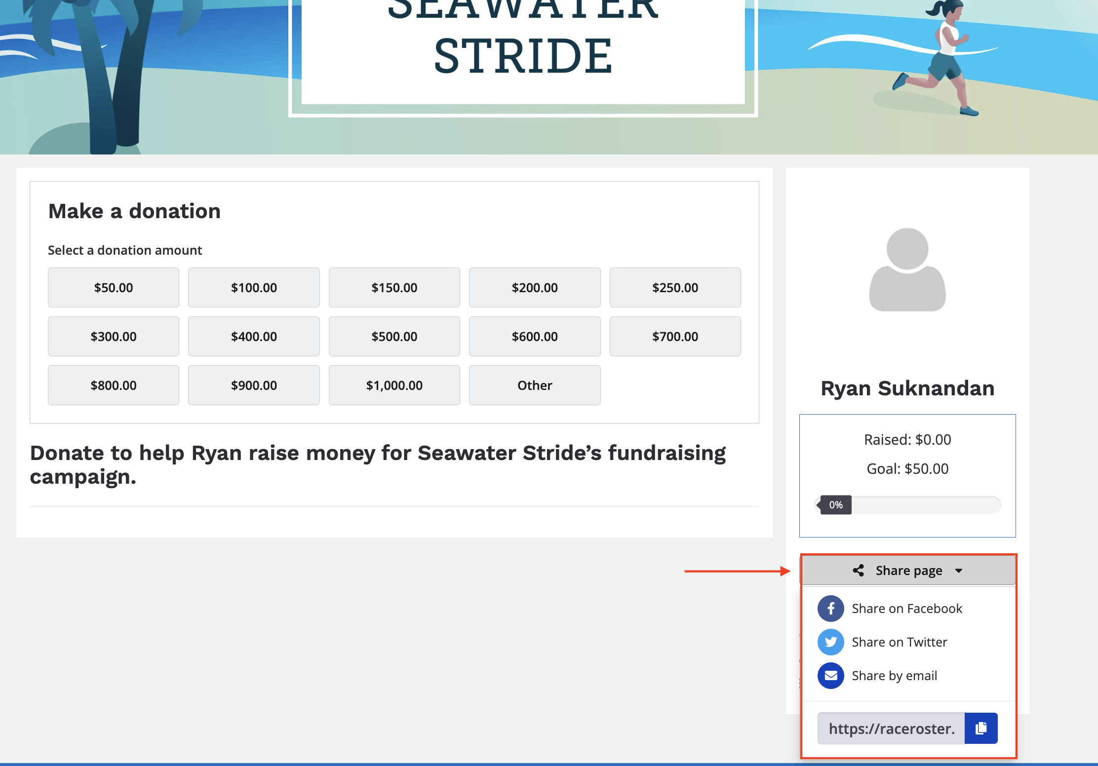 - On your personal pledge page, you will see a share page dropdown menu containing Facebook, Twitter, and email share buttons, along with a direct link to your pledge page to be copied