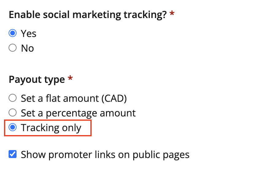If an event wants to track referrals but does not want to offer a monetary payment to their promoters, there is a tracking only option available within the referral settings. This option allows event organizers to keep track of the number of successful referrals from their promoters, but does not issue any automated payment from Race Roster. Using the tracking only option provides event organizers with the flexibility to reward their promoters through any form of compensation of their choice. Read our article How To Set Up The Tracking Only Option For The Social Referral Tool for more information on this option.