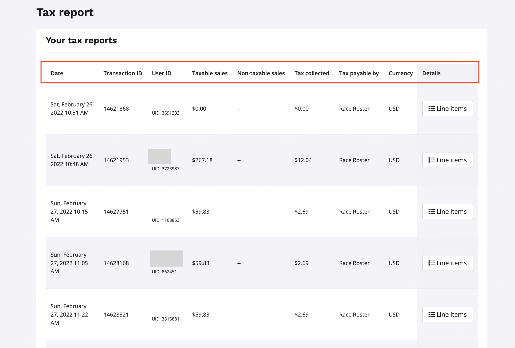 4. By clicking on the white line items buttons under the details column, you can view a breakdown of each transaction line by line outlining: