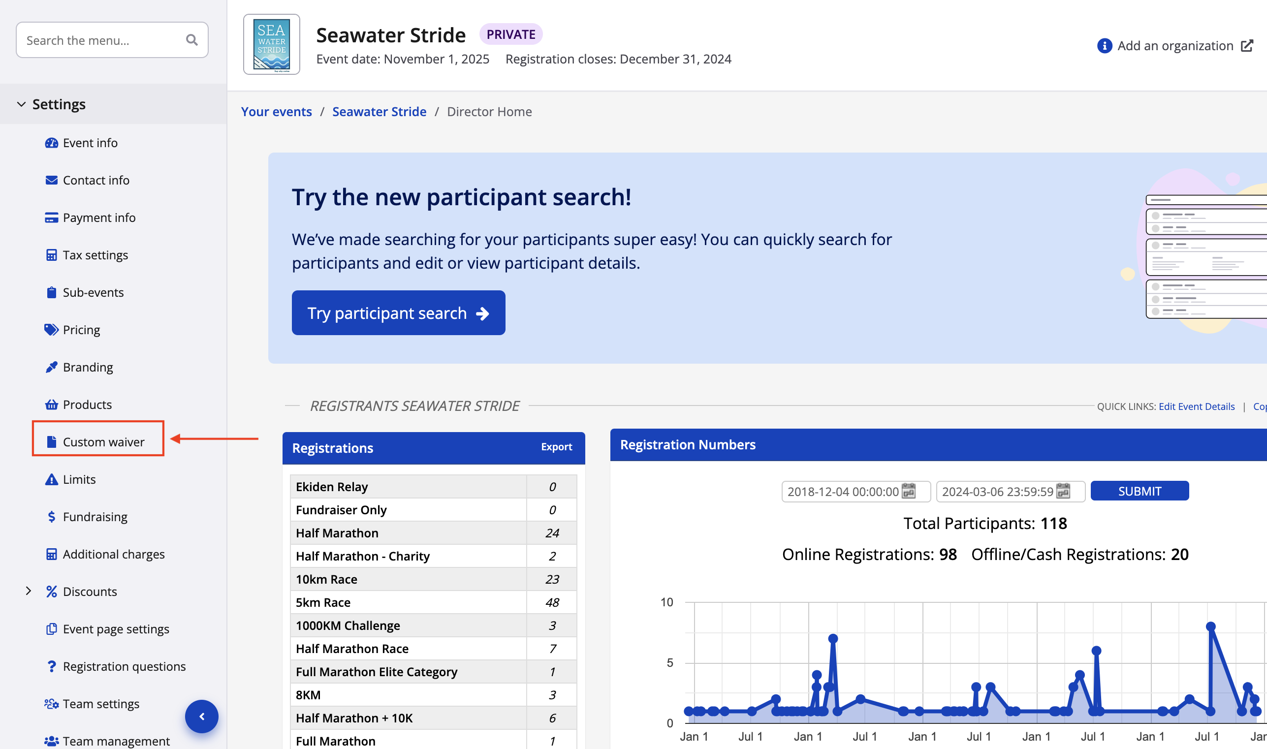 1. From your event dashboard, click on settings -> waivers from the lefthand side menu.