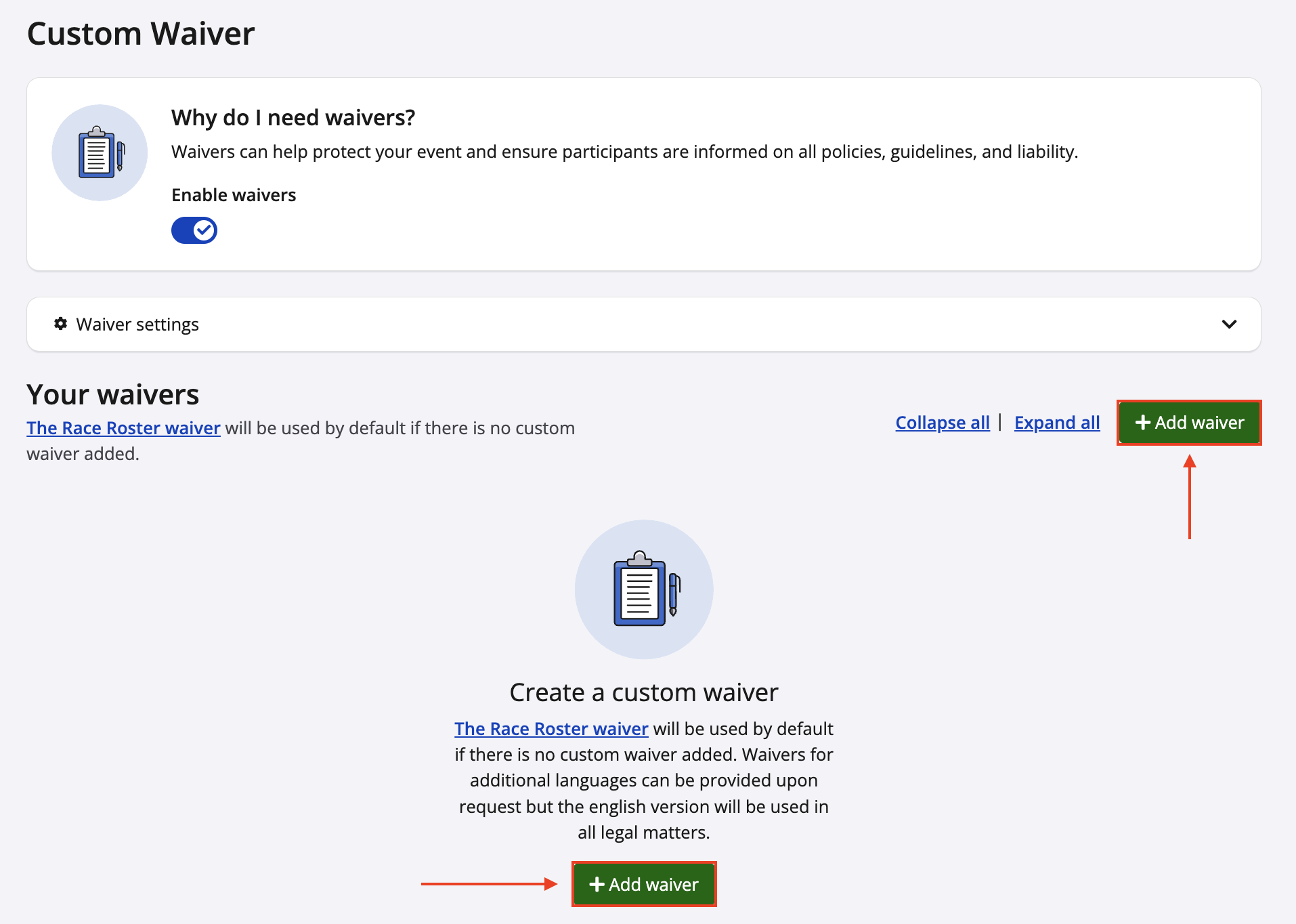 2. From your waiver settings, click the green add waiver button to begin creating a new waiver.