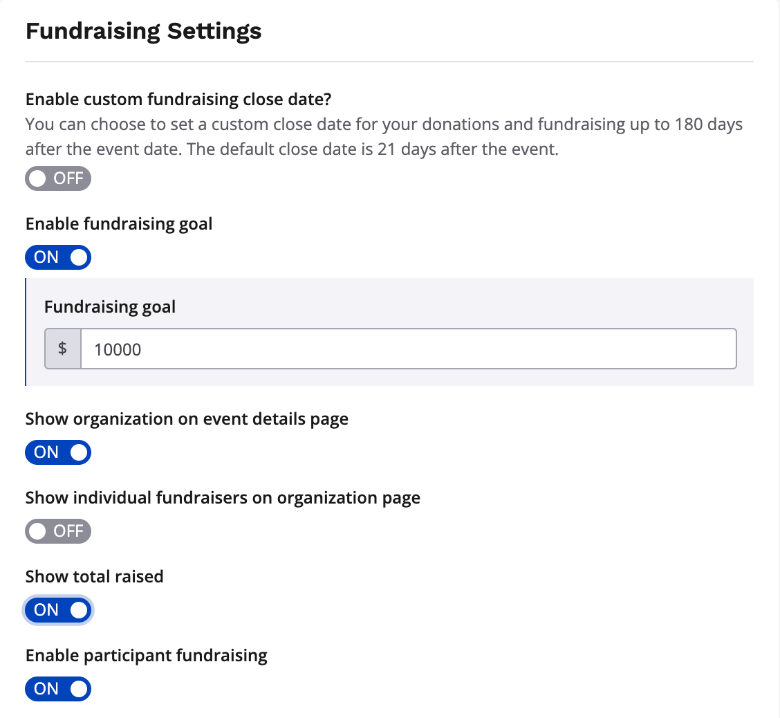 4. Scroll down to the Fundraising Settings section and toggle on enable fundraising goal. You will then be prompted to enter a number for your organization's goal. If you would like the goal and fundraising thermometer displayed on the event details page, make sure toggle on Show organization on event details page.