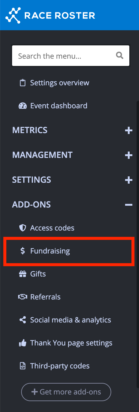 2. Navigate to the left of your screen and select Add-ons, followed by Fundraising from the drop-down menu.