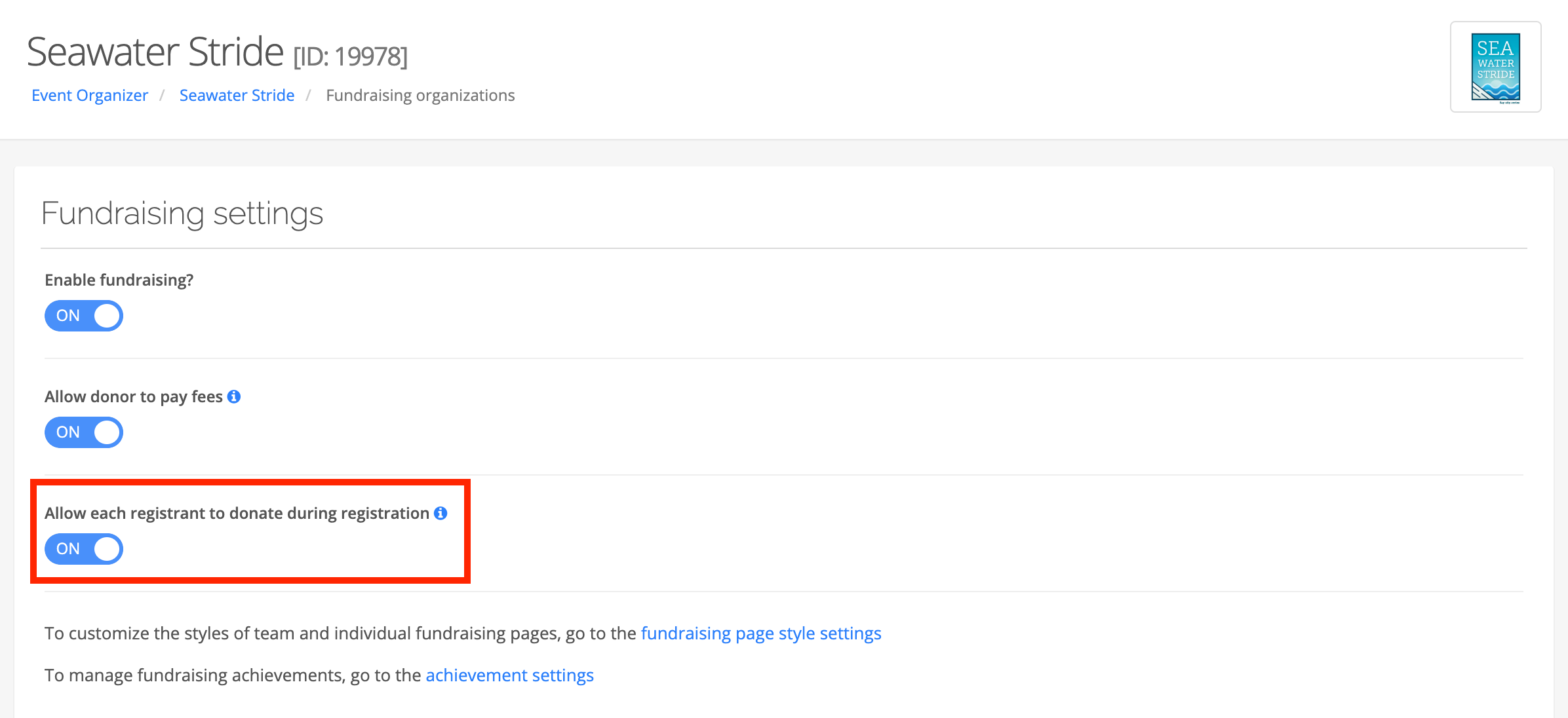 3. Navigate to the fundraising settings and click on the toggle Allow each registrant to donate during registration to turn this feature on.
