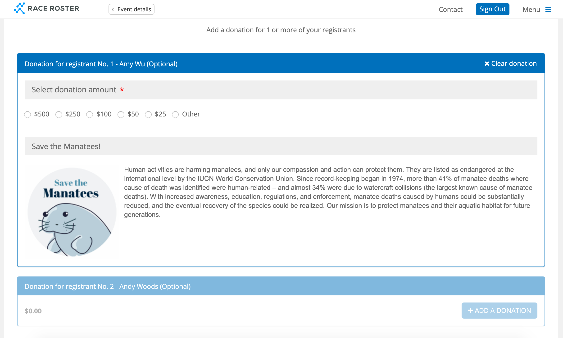 1. The user will be prompted to the donation page where they will see each registrant listed.