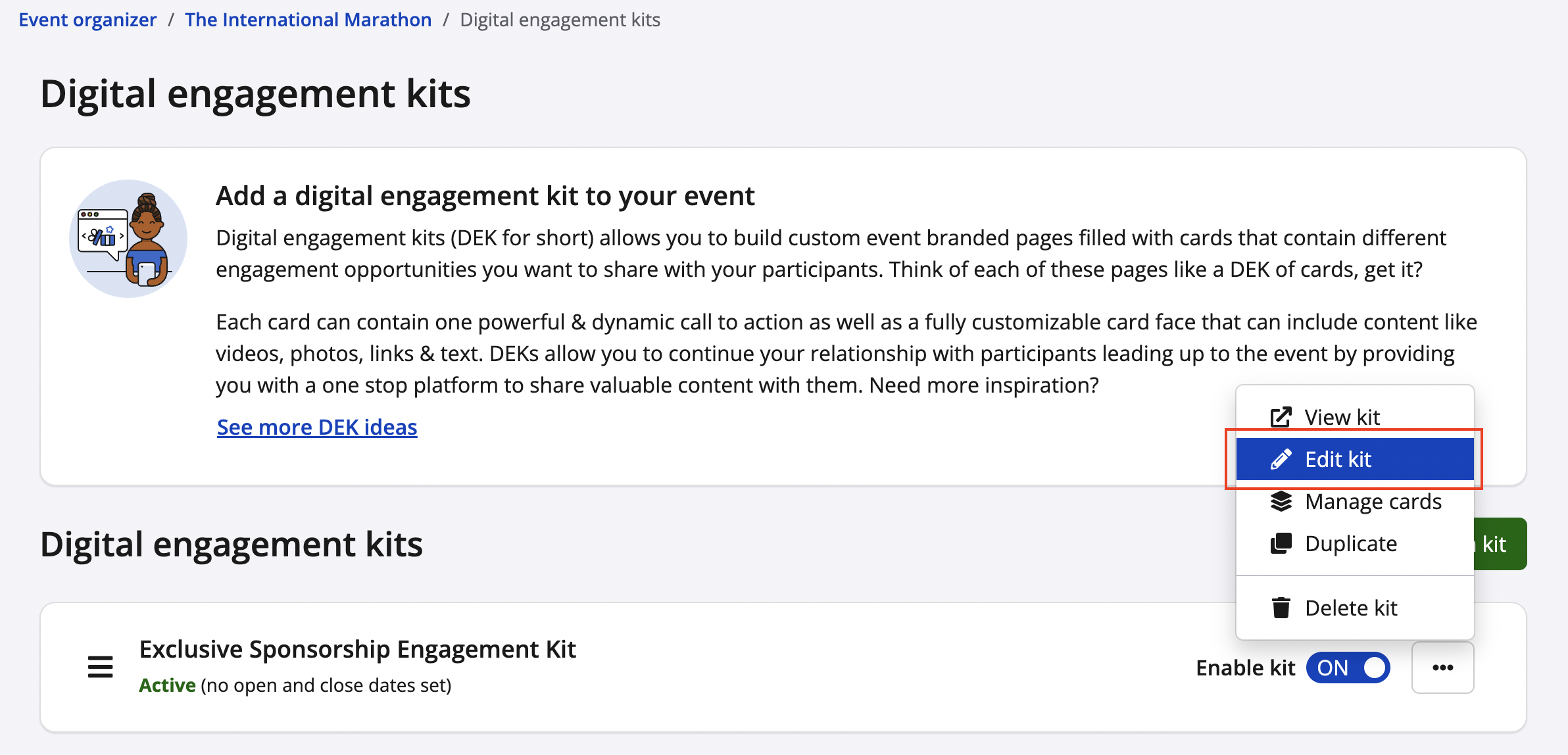 Select one of your already-existing digital engagement kits (or create a new kit by following this guide) and click edit kit