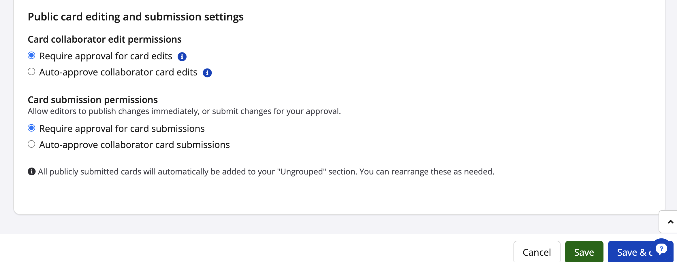 Scroll down to the bottom of your kit settings to the Public card editing and submission settings. Configure your permissions for how you want card collaborators and card submissions to be approved. Public edits to existing cards or new submissions will either require your approval, or you can allow auto-approved edits and submissions instead.