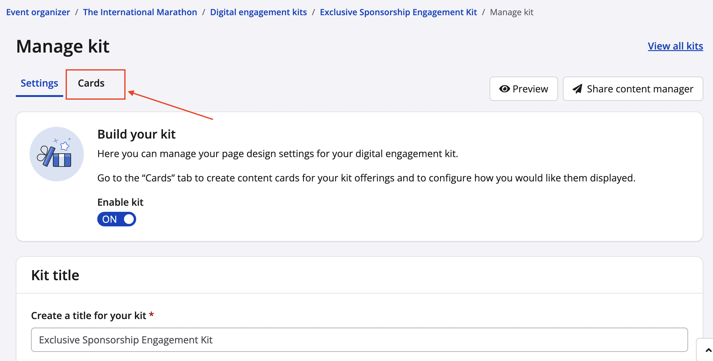 Within your kit settings, scroll to the top of the page and click on the cards tab to view your existing cards.