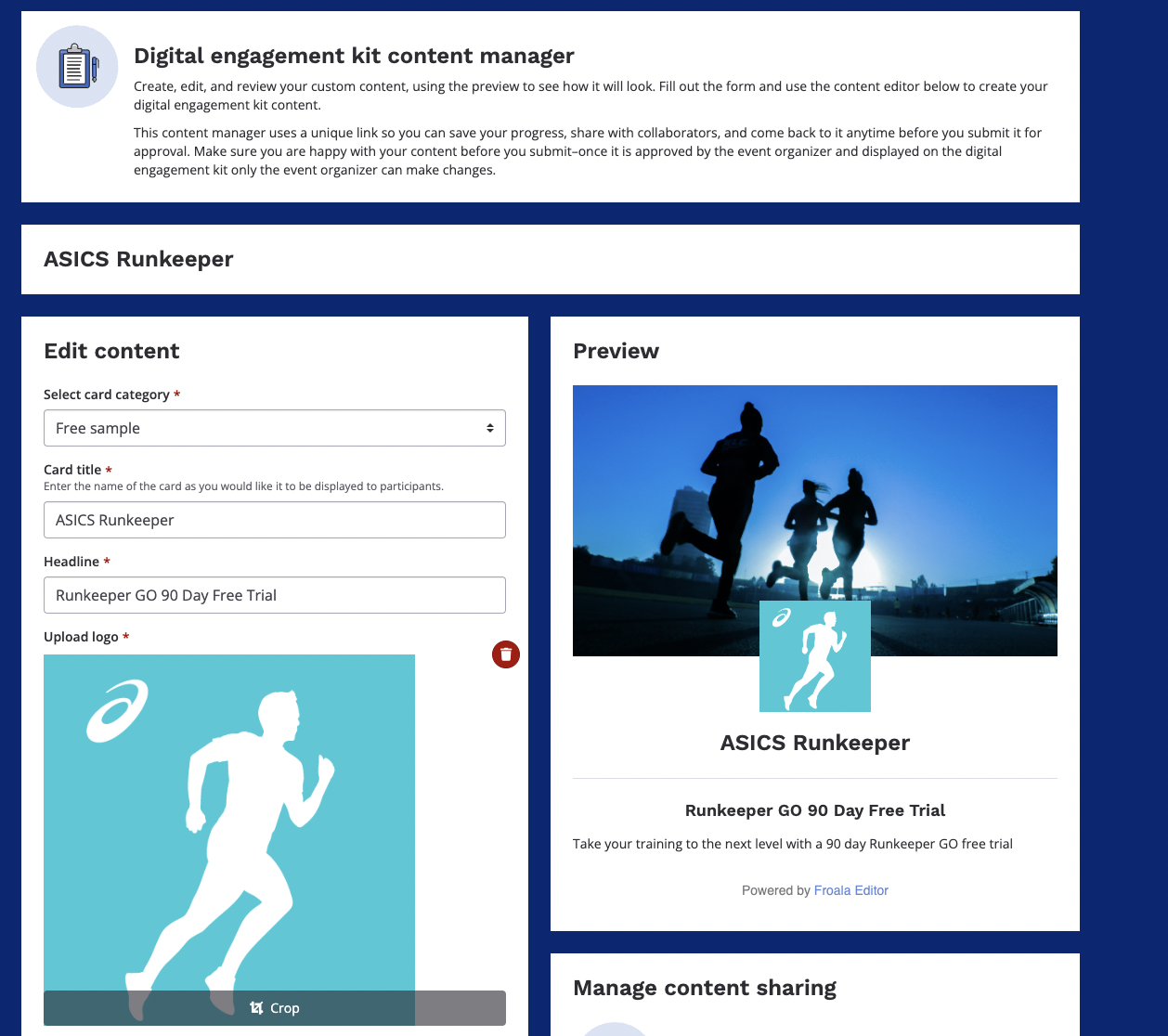 The user will now have access to create a brand new card from scratch in the exact same way that an event organizer creates a card from within the digital engagement kit settings. Users can add a logo, a cover image, custom text, a custom CTA, as well as any necessary links/files/promo codes. Once the user has finished creating their card, they can click the submit button to request approval for the submission (or it will be auto-approved if this permission was selected).
