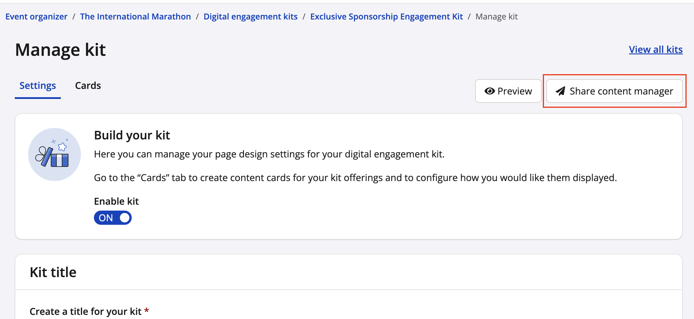 Select the kit that you'd like to give access for card submissions. At the top of the kit settings page, click on the share content manager button to find a unique link that can be shared with anyone who wishes to create a card for your existing kit.