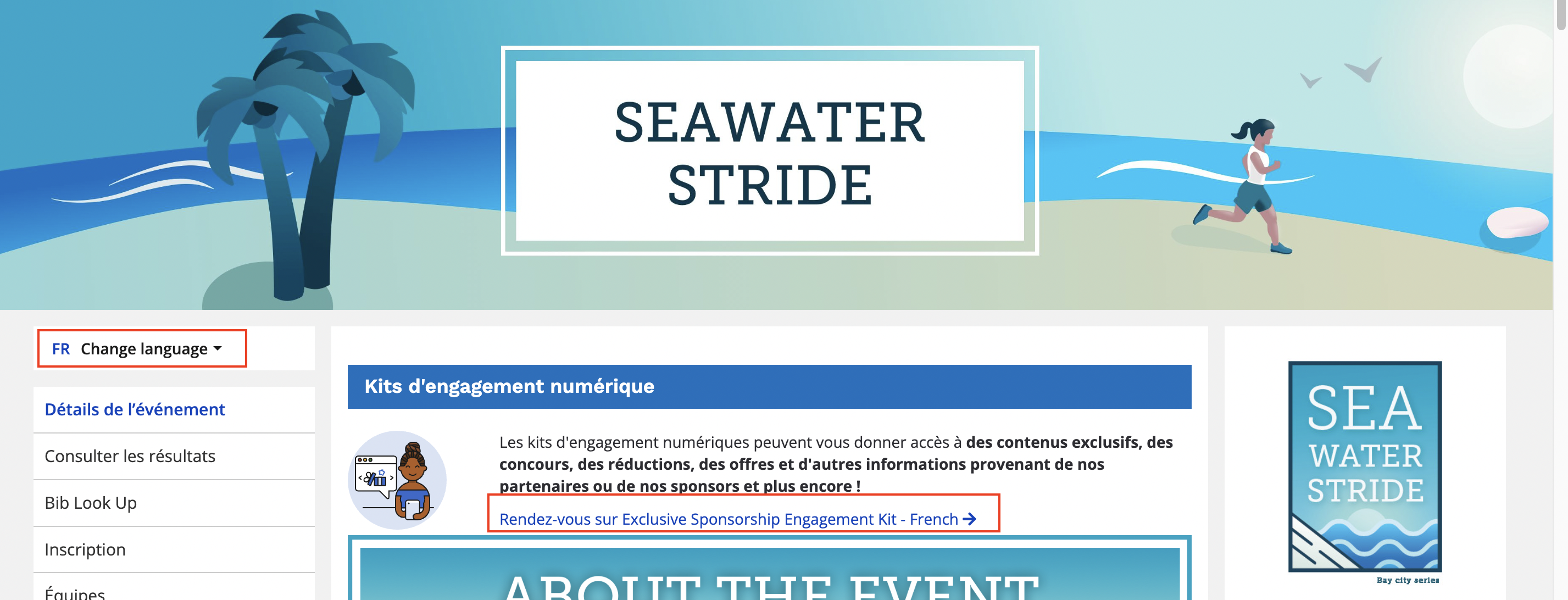 Once saved, your translated digital engagement kit will now display by default ONLY when you toggle your event's language to the corresponding language from the top left hand corner.
