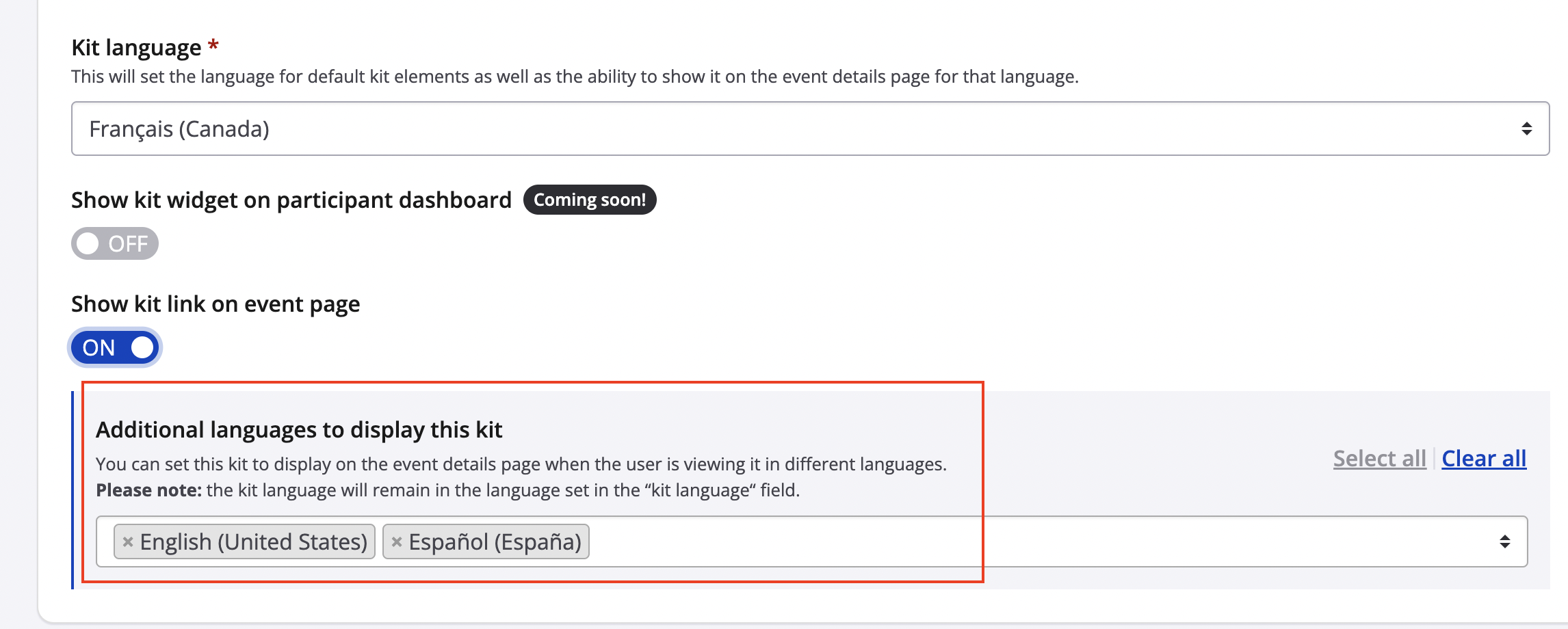 4. If you wish to have your translated digital engagement kit display on other languages on your event page, return to your digital engagement kit settings and scroll to the bottom of your page under show kit link on event page and toggle on any additional languages you'd like have your translated kit display on.