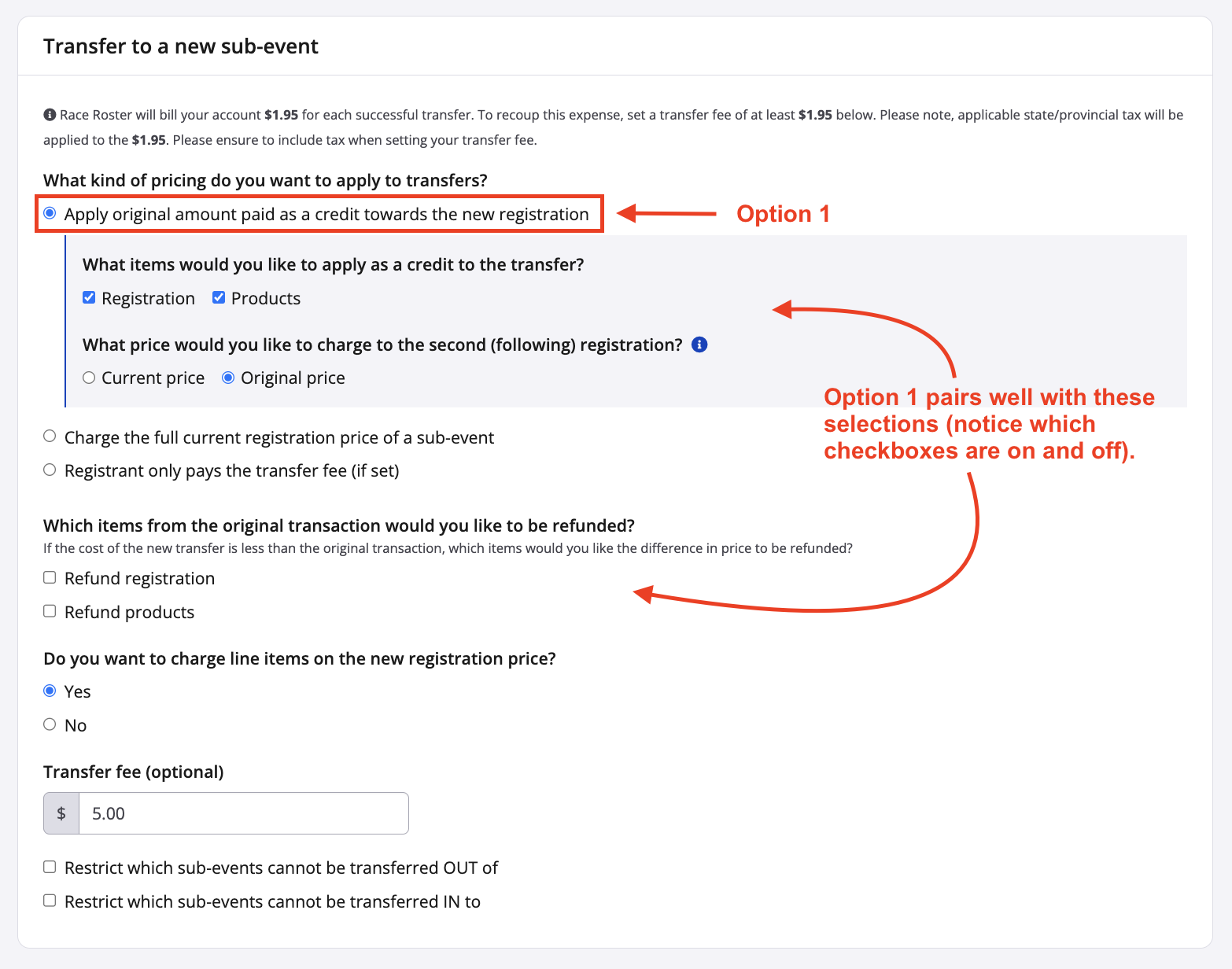 When selecting this second option, the new registration resulting from the transfer will be prompted to make full payment at the current price. See screenshot below for a sample setup for participant transfers.
