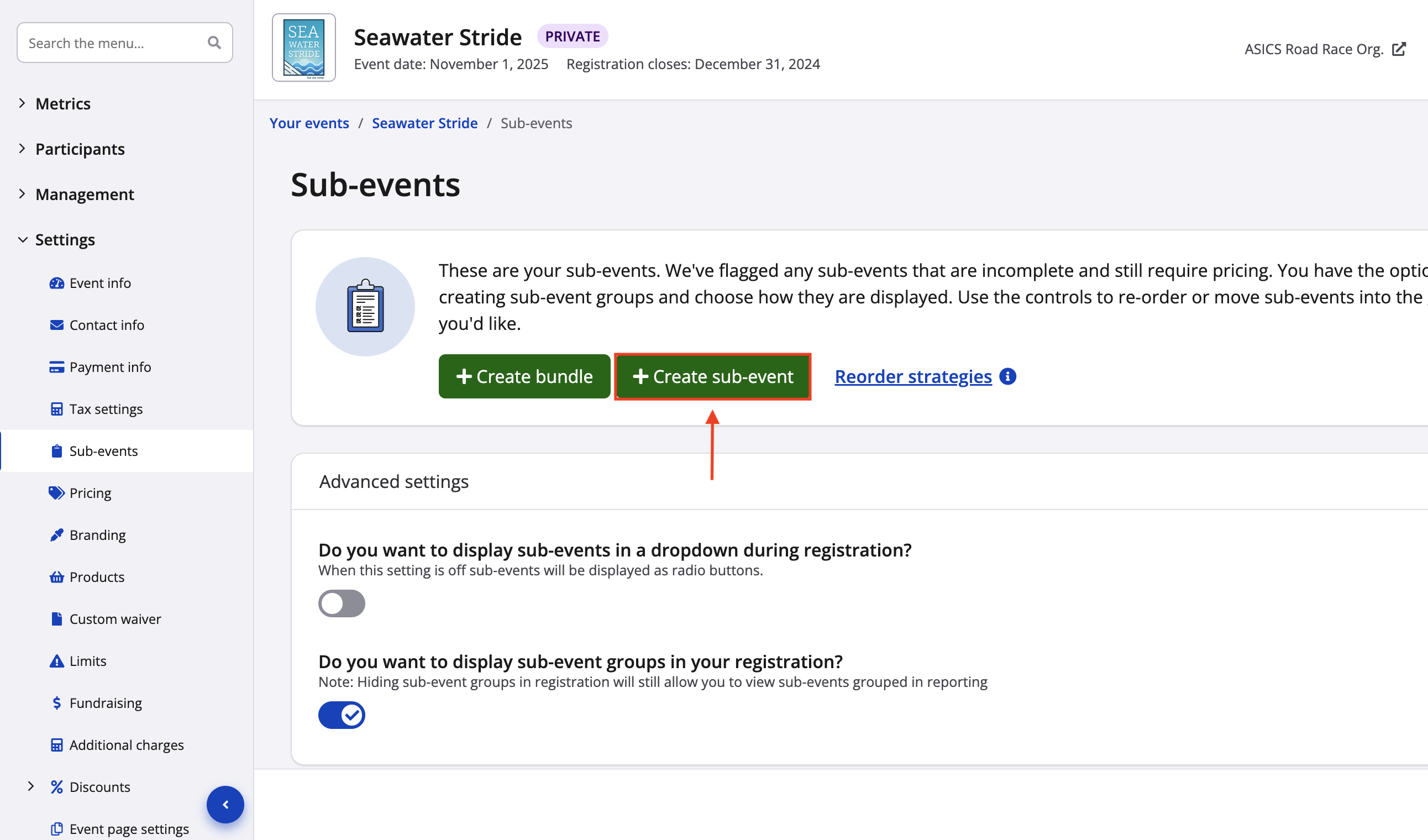 1. From your event dashboard, click on Settings > Sub-events.