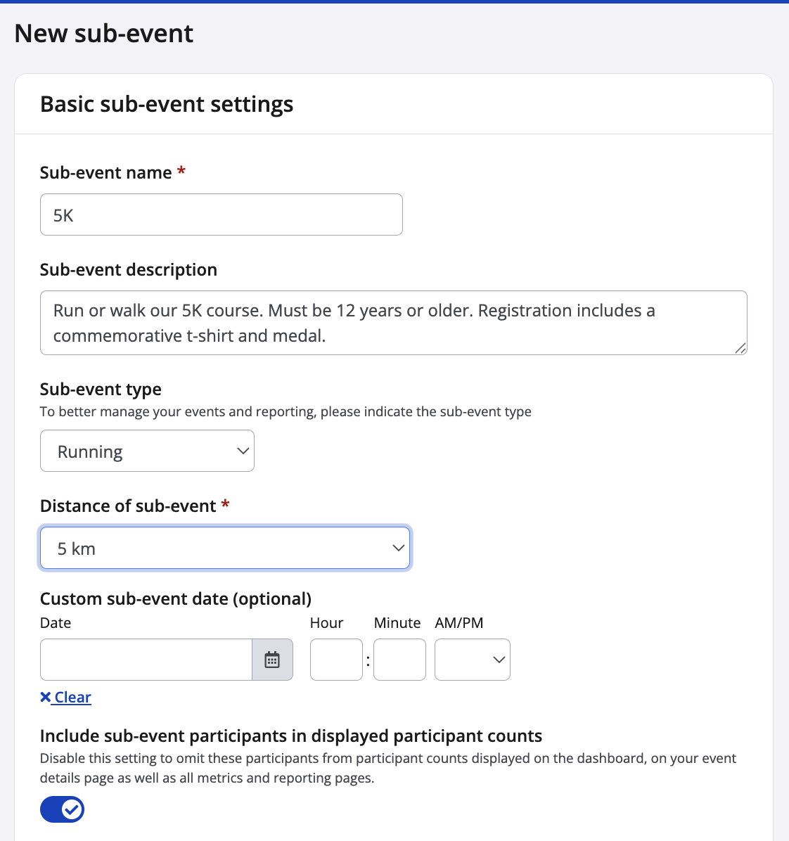 - Custom sub-event date (optional) - This appears in the confirmation email and link. Insert a custom sub-event date if the sub-event has a separate date from that within the event info settings, or if yours is a multi-date event and want to specify when this distance/sport will take place.