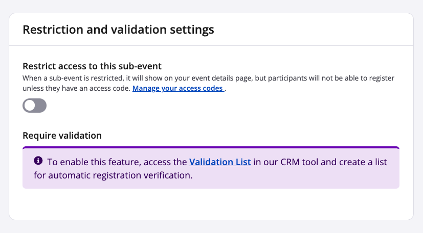 - Restrict access to this sub-event: When enabled, this toggle locks the sub-event from the general public. In order to register, the use of an access code is required. An access code may be distributed to a select person or group of people.