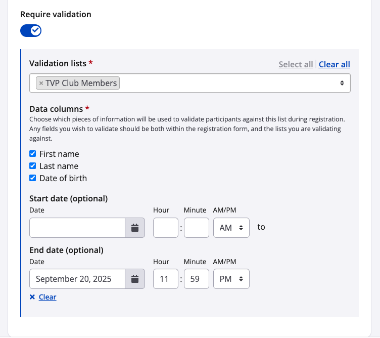 End date (optional): Choose a date on which the sub-event stops validating against the list. For example, if you launch registration for a gran fondo and want to reserve early bird registration to your cycling club members (say, until end of day on September 20), you may use this setting so that the "TVP Club Members" validation on the sub-event ends that day. Afterward, validation will no longer be required for the sub-event and the public can register, too.