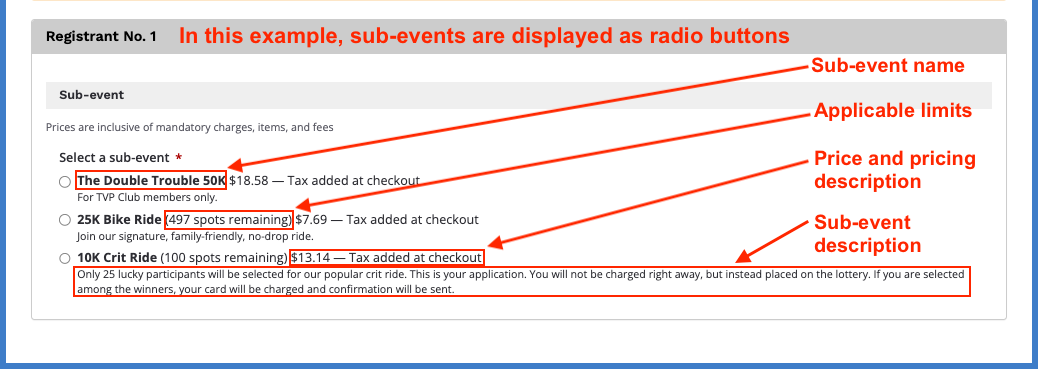 - toggle off: sub-events are displayed as radio buttons; the sub-event name and (if applicable) limits, price and pricing description will be on one line; its corresponding sub-event description (if any) displays as the next paragraph